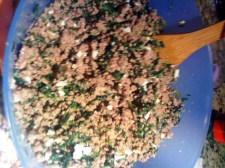 Hardboil your 5 eggs and set aside. Cook spinach according to package, drain completely (will need to squeeze out as much water as possible) and set aside. Dice the 3 small onions (I put them in the mixer to make them extremely thin, but this is not necessary). Brown your meat with the onions. Add salt & pepper to taste. Once cooked, combine all ingredients in a bowl and set aside.