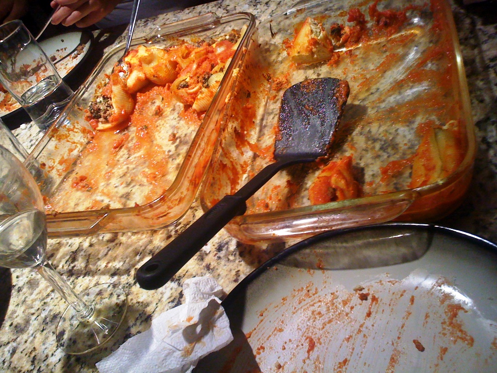 I forgot to take a picture of the cheese filled shells, but here is the finished product. Way more dry than I would have liked, but they were still good. I made three trays and two and a half were gone at the end of the night. My neighbor and his girlfriend stopped by to help out, but we did some major damage even though there was a lack of sauce.