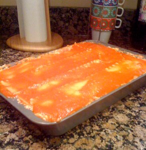 The cheese filling was fairly easy to make, but I didn’t have a large enough mixing bowl and the cheese was getting all over the counter. I must say that making the lasagna was the messiest kitchen adventure I have had thus far, but it was well worth it. I didn’t have time to make homemade noodles for the lasagna unfortunately, but I am pretty sure if I would have attempted that I would have gotten in a little over my head. The Barilla (cl) lasagna sheets worked out just fine and I am sure my dinner guests were happier I went with that route anyway!