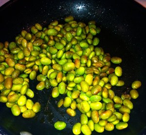 Heat sesame oil over medium heat (just enough in to lightly cover the bottom the pan). Once hot, add the edamame, lightly cover in soy sauce, and add a few shakes of ground ginger. Continue to stir until the liquid has evaporated and let cool.