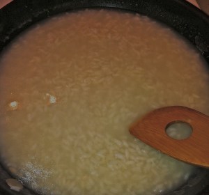 Heat olive oil and butter in a large pan. Add the rice and coat in oil. Toast the rice for about 3 minutes. Reduce heat and add some garlic powder (a few shakes) and the white wine. Once the wine has evaporated, add in 1 1/3 cup of hot water. Stir continuously until the water has evaporated and the consistency is creamy. Continue this process two more times. Remember to keep stirring. Once the rice is creamy, but still slightly firm, remove from heat.