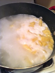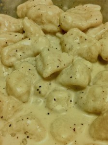 When cool enough to handle, but still warm, add the egg, flour and nutmeg. Mix evenly (work as little as possible so that it does not become doughy). Take a small lump and roll on a well floured surface. Test it in the boiling water to make sure it doesn’t fall apart and cooks properly. Once you are sure it’s ready – roll out the dough in strips about as thick as your fingers (thumb or pinkie, it’s up to you). Cut it into pieces of equal width and height, about the size of the tip of your thumb. Make sure they have enough flour on them, but not too much.