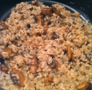 While the mushrooms are cooking, heat olive oil and butter in a large pan. Add the rice and coat in oil. Toast the rice for about 3 minutes. Reduce heat and add some garlic powder (a few shakes), the white wine and chicken broth. Once the wine and broth has evaporated, add in 1 1/3 cup of hot water. Stir continuously until the water has evaporated and the consistency is creamy.