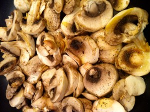Saute the mushroom in olive oil, coat with 1 tbsp of truffle oil, and season with salt, pepper and a few shakes of basil.