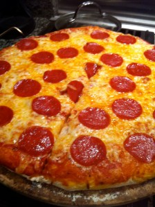 Follow the directions on the back of the Trader’s Joe dough package. Once the dough is ready and rolled out, spread the sauce from end to end (put as much as you would like). Sprinkle with the mozzarella cheese, add the pepperoni and put it in the oven! It is THAT simple!