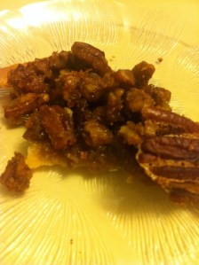 I wanted to bring it home for Thanksgiving, but decided to have a small piece anyway! I’ve only had Pecan Pie once before, but I thought it tasted pretty good. It definitely fell apart once I put it on my plate, but the flavor was good!