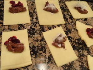 Cut the pie sheets into small squares and fill them with a small bit of Nutella and any other ingredients you want. I added craisins to some, peanut butter to a few and to be honest, I can’t remember what else I used, but I know I pretty much cleaned out my pantry of sweet stuff. I just put Nutella on all of the pies and then made some with chocolate chips and peanut butter, some with just craisins, some with coconut, etc.