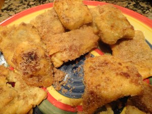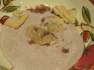 My first few attempts didn’t go over so well. The pies were falling apart and getting stuck in the cinnamon and sugar mixture. I figured out that the oil wasn’t hot enough and the pies weren’t really frying, so I turned up the heat and let the oil get hotter before I added the pies.