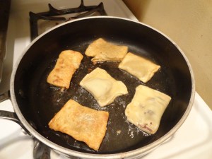 In a large frying pan, heat the oil, but make sure it doesn’t get too hot or the pies will burn. Remember the Kitchen Adventure I had with Caprese Wontons? Once the oil is hot enough, begin folding the pies together and adding to oil. Fry until the outsides are golden brown and then immediately add to the cinnamon and sugar mixture.